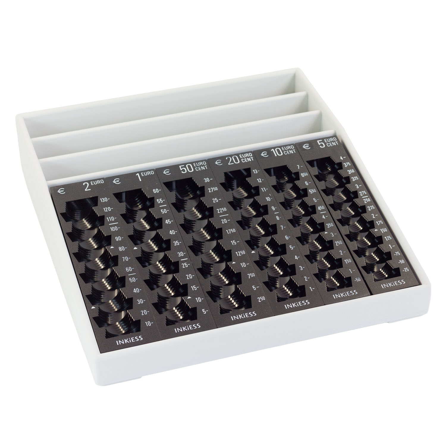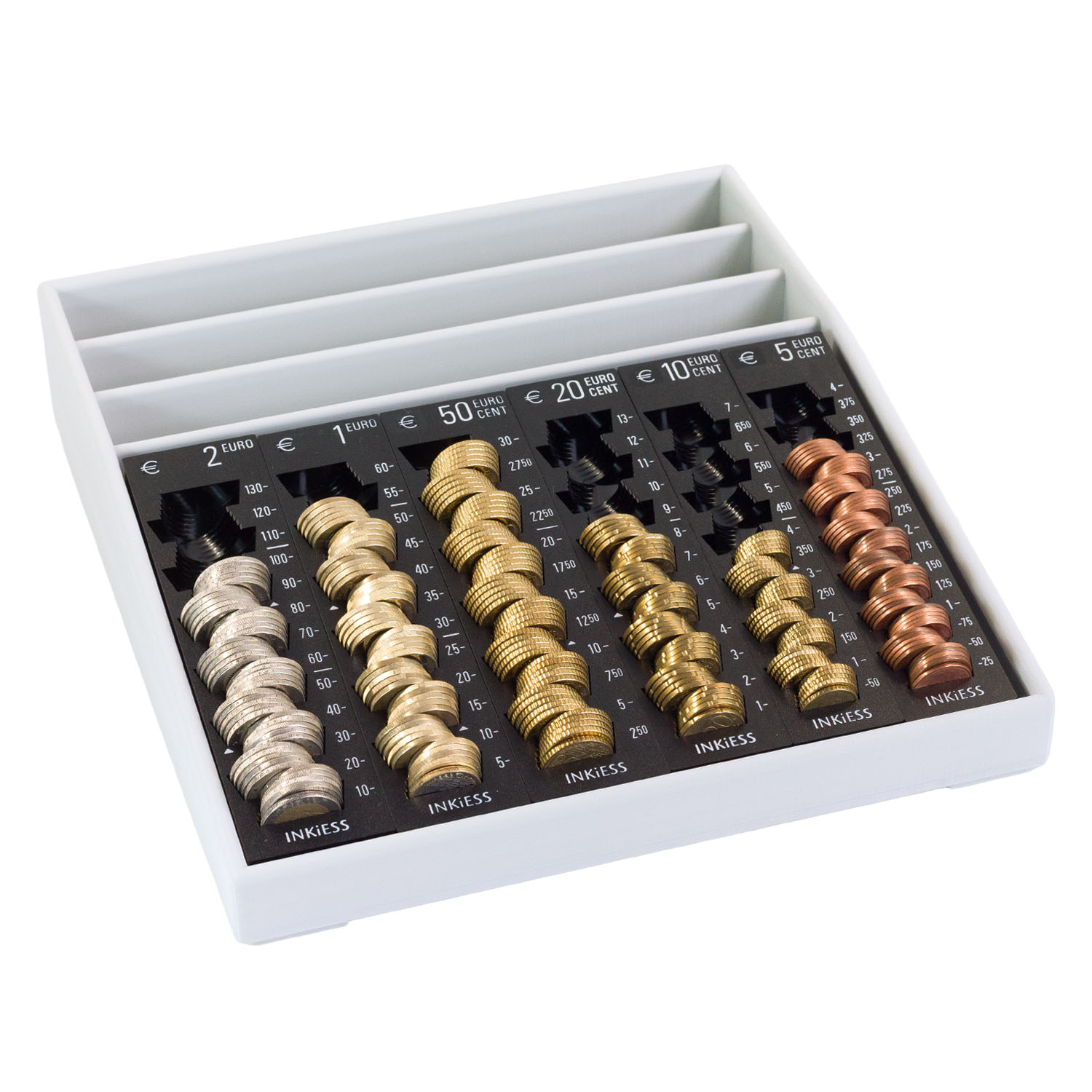 | Ausstattung: | 6 Einzelmünzbehälter von 2 EURO - 5 Cent 3 Banknoten-Steilfächer im Untersatz |