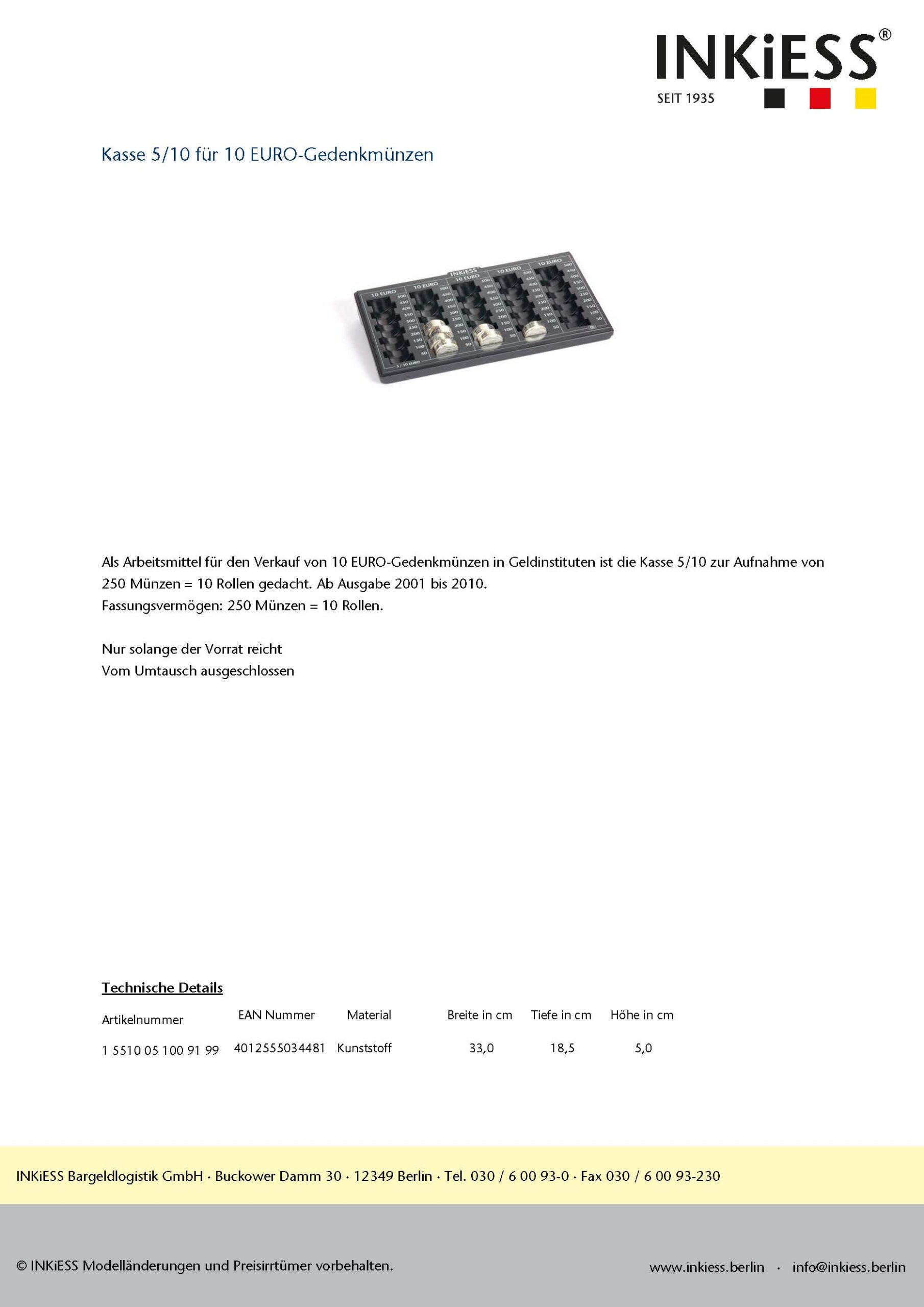 Als Arbeitsmittel für den Verkauf von 10 EURO-Gedenkmünzen in Geldinstituten ist die Kasse 5/10 zur Aufnahme von 250 Münzen = 10 Rollen gedacht. Ab Ausgabe 2001 bis 2010.