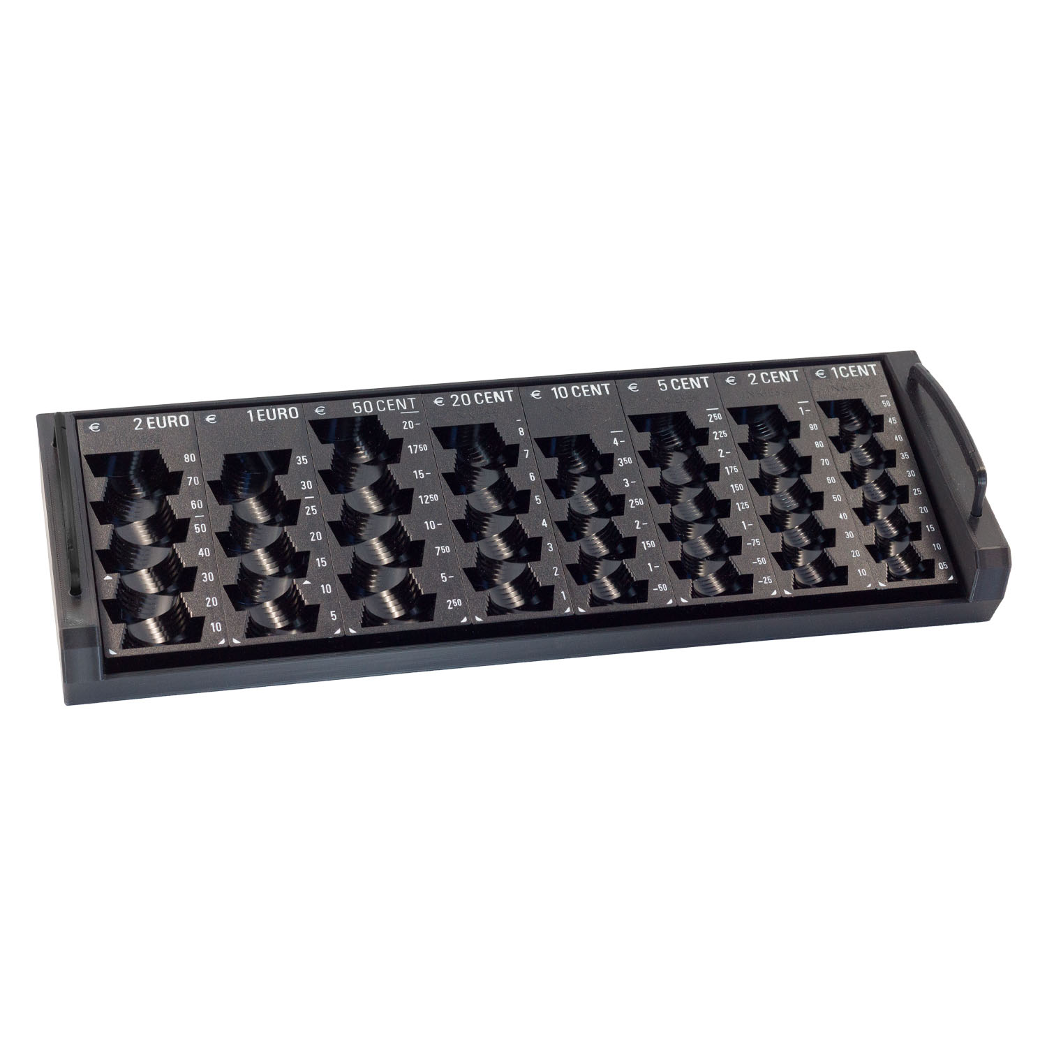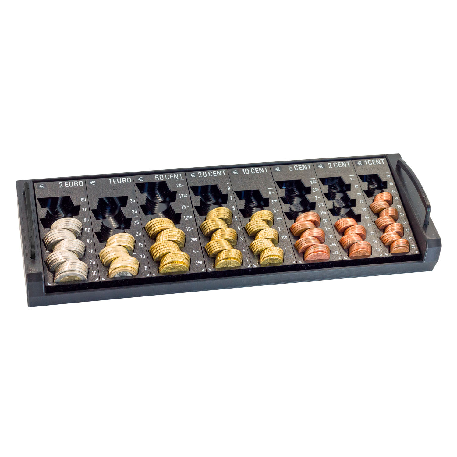 Der INKiESS Kasseneinsatz für Ihre Kassenlade, mit seitlichen Griffen und 8 herausnehmbaren Einzelmünzbehältern von 2 EURO bis 1 EURO-Cent.