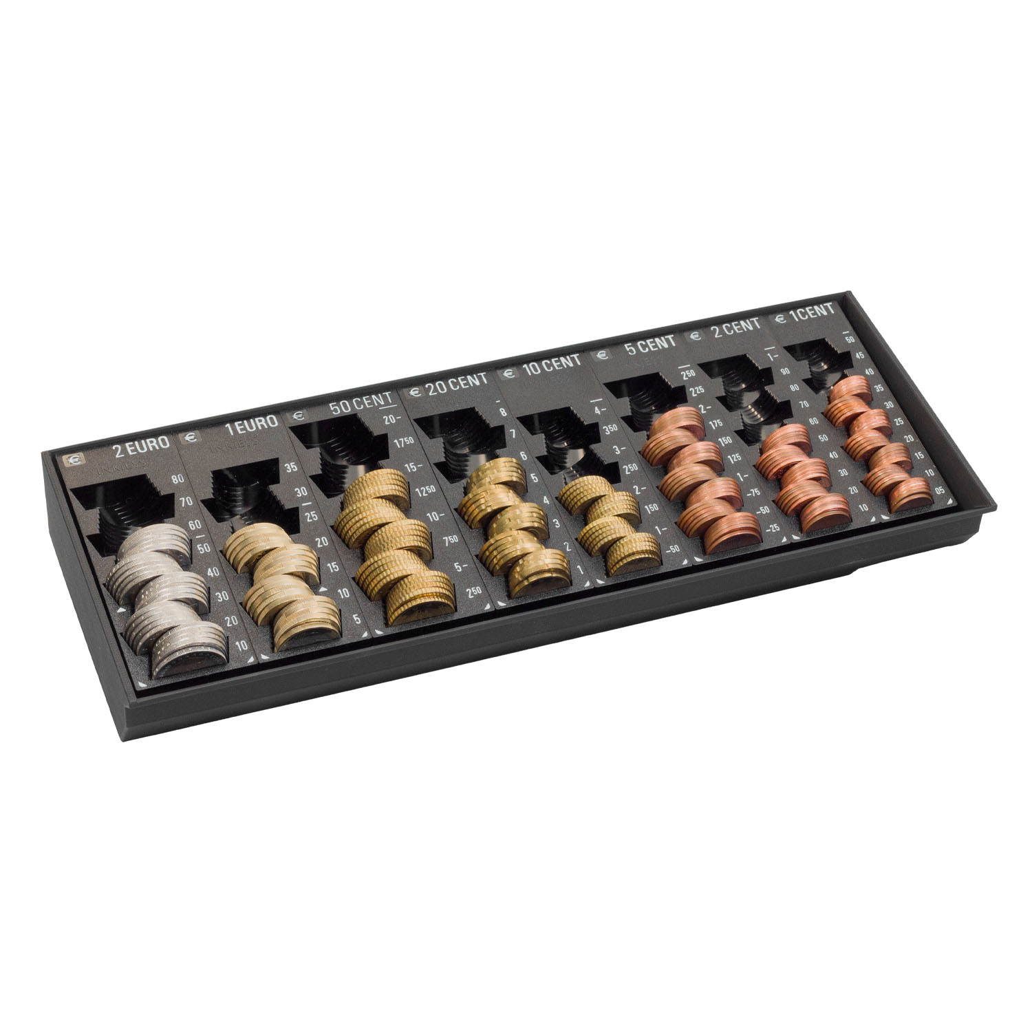 Der INKiESS Kasseneinsatz für Ihre Kassenlade DDS 2N, mit 8 herausnehmbaren MiNiKORD Einzelmünzbehältern (Münzrillen) von 2 EURO bis 1 EURO-Cent.